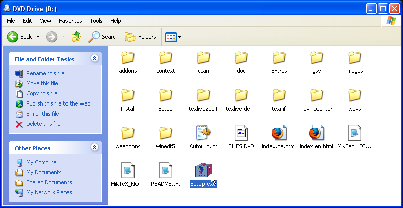 install-tl.shfor Linux and Mac systems, andSetup.exefor Microsoft Windows (on the TEX Collection 2003 CD it was calledTeXSetup.exe). Just occasionally a bug slips through onto the production CD or DVD, and although it's always fixed and notified on comp.text.tex, that's a high-volume newsgroup and even the sharpest eyes may miss an announcement.- Stick to the defaults